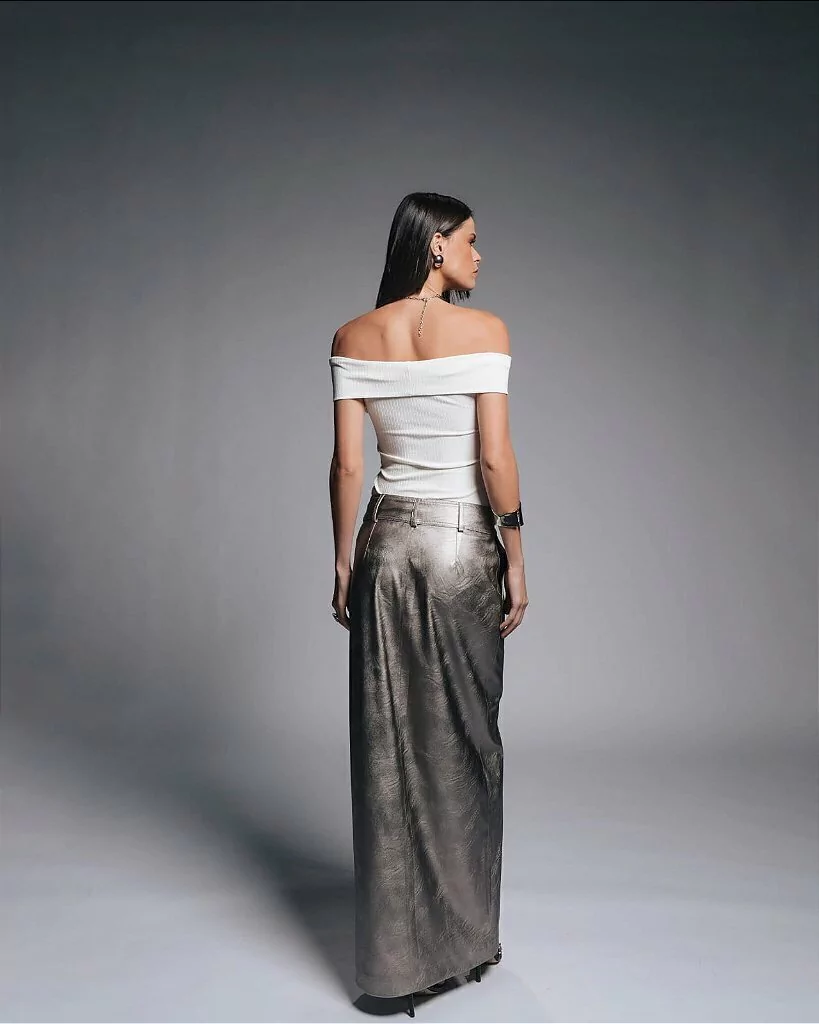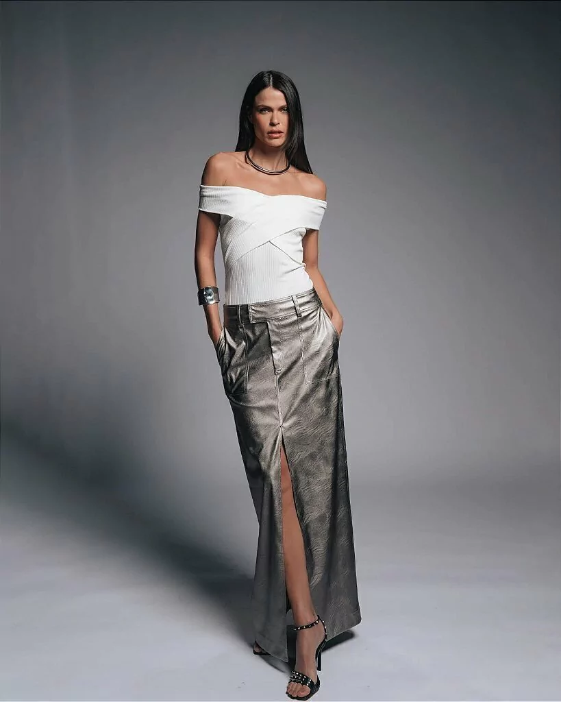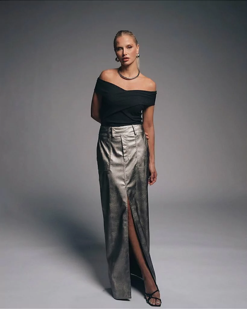 Saia confeccionada em couro metalizado. A Saia possui comprimento longo, shape slim, cós transpassado, bolsos faca e fenda frontal, que possibilita um visual elegante, moderno e sensual. Uma peça ideal para entrar na tendência da estação, o metalizado. TECIDO DE COURO 100% POLIÉSTER